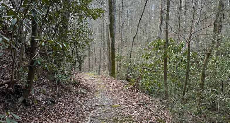 From the bald, hike 0.8 miles down the Waucheesi Mountain Road to where the trail leaves the road. The bald itself and the hike down the road offers majestic views of the surrounding mountain ridges, many of which exceed 5000 feet in elevation. At mile 0.8, leave the road down a steep slope off the edge of the road to the left. A post with the Warrior's Passage symbol marks the start of the trail. The trail quickly levels out and descends the steep slope of the mountain in a series of switchbacks in mature hardwoods. At mile 1.5, the trail enters an area of pine recovery after a forest fire in the late 1990s; thus the trees recovering are over 10 years old and are growing very densely. The trail forms a tunnel through this dense pine foliage. Many old dead pine trees are still standing and you may have to cross over some of these trees if high winds have knocked them down since the last trail maintenance. At mile 1.8, you again enter a mixed pine and hardwood forest down a steep ridgeline between Tobe Creek on your right and Rocky Branch on your left. At mile 2.1, you reach Mule Pen Gap and cross a gated forest service road right by the gate. From here you skirt along the north side of a ridge then travel down the ridgeline to a crossing over Tobe Creek at mile 3.3. At mile 3.6 you cross Bald River Road and head uphill through another heavily burned-over area of more recent vintage. These areas of forest were burned over in the late 90s. These areas afford great views and an